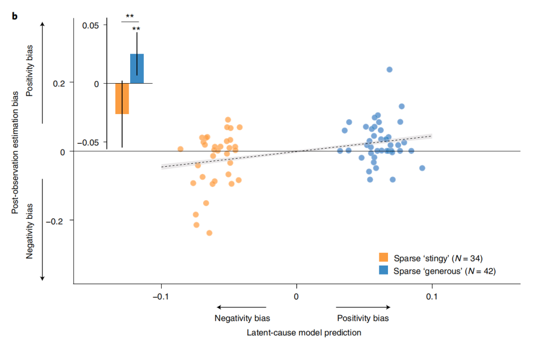 之后,研究者提出潜在归因模型,指出模型的预测和真实情况是相符的。在该文的讨论部分中,作者指出负面归因这一人际交往中的常见现象,其来源是消极事件的罕见(突发)及影响大,从而使人们在认知过程中高估了消极事件的影响。该研究还给出了如何缓解这一认知偏差的方法,即提醒受试者关注平均数。