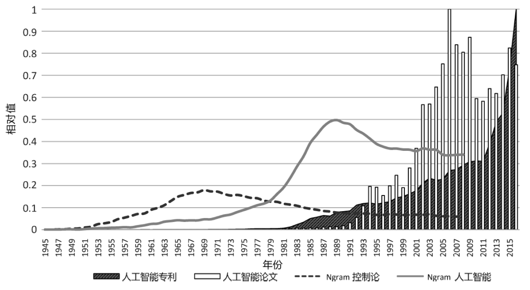 人工智能自诞生之日起的 60 多年中,经历了跌宕起伏的发展过程。如果用谷歌 Ngram 来衡量,从控制论算起,人工智能目前一共经历了两次高潮。第一次高潮是在 20 世纪 80 年代,正是专家系统和日本第五代计算机项目得势的时候。进入 20 世纪 90 年代后,人工智能呈现出下滑趋势。第二轮高潮是进入 21 世纪之后,辛顿及其学生 2006 年在《科学》(Science)杂志上发表的深度学习文章引发了新一轮人工智能发展的高潮。