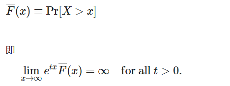 如果 X 的矩母函数,Mx(t)对于所有 t>0都是无限的,则具有分布函数 F 的随机变量 的分布被称为重尾(右)。