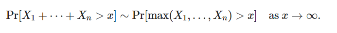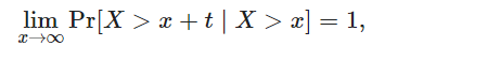对于右尾长尾分布的随机变量有一个直观的解释,即在长尾分布随机变量尾部取值已超过某个高水平的条件下,它将超过其他更高水平的概率接近于1。