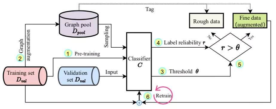 通过提出的启发式数据增强方法,我们可以生成大量的弱标注样本,扩充图数据集的规模。然而,考虑到数据增强会引入一定的噪声,生成得到的弱标注样本是否可以直接用于训练依旧值得思考。在计算机视觉中,数据增强对图像的语义信息几乎不会造成破坏,然而对于图结构数据,由于其性质极度依赖于拓扑结构,通过修改图结构生成的样本可能会丢失原本的语义信息,原本的标签不一定适用于新生成的样本。鉴于此,作者引入了“标签可信度”的概念,用于衡量样本和其标签的匹配程度,达到数据筛选的目的。