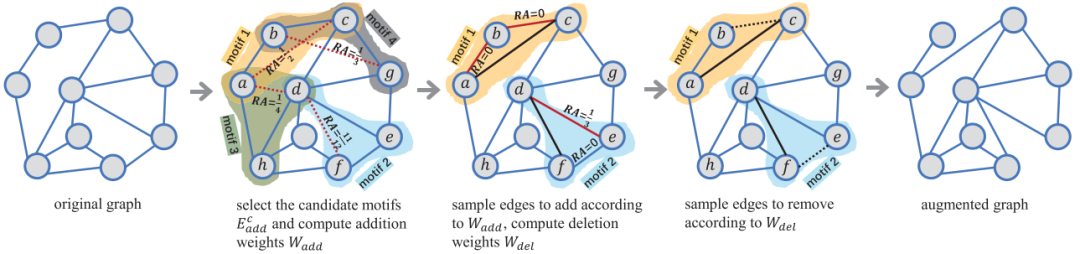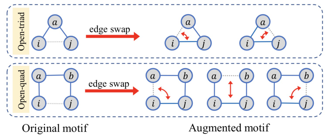 这项工作中,主要研究的对象是图分类任务。对该任务,作者提出了针对图的若干启发式的数据增强技术,包括随机映射、节点相似度映射、模体随机映射以及模体-相似度映射。其中随机映射通过对原始图进行一定比例的随机重连生成新的图;节点相似度映射删除相似度较低的节点对之间的连边,增加相似度较高的节点对之间的连边;模体-随机映射通过对网络中的特定模体进行边交换来丰富网络结构,如图3所示;模体-相似度映射在模体随机映射的基础上,将节点相似度作为采样权重,如图4所示。