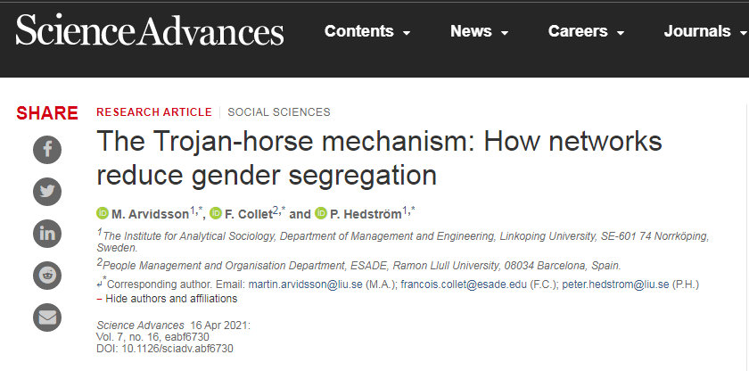 在劳动力市场中,性别比例不平等包含了众多议题:从就业歧视到收入不均,从工作分工到职场天花板。每一个对立的事件都会引发社会热议。在既往的研究中通常认为基于同质性网络的招聘方式是造成这一问题的主要原因。瑞典林雪平大学的 M. Arvidsson、P. Hedström 和西班牙拉曼鲁尔大学的 F. Collet 就对这一问题给出了新见解,提出了社交网络中的特洛伊木马机制(Trojan-horse mechanism)。该研究于 2021 年 4 月 6 日发表 Science Advances 上。