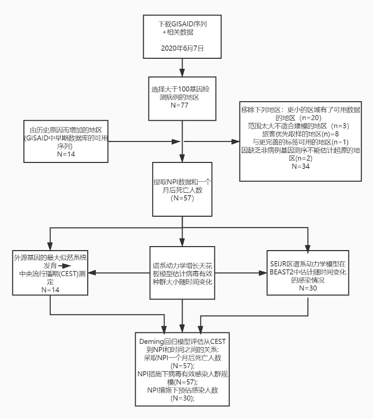 为遏制COVID-19疫情,很多国家采取了前所未有的公共卫生干预措施,包括旅行限制和国家封锁,但对于非药物干预的有效性仍存在争议。Manon Ragonnet-Cronin等人对来自57个地区的2.9万多个公开可用的SARS-CoV-2全基因组序列进行了系统发育分析,以估计疫情在不同地方起源的时间。这些估计数与每个地点最严格干预措施的日期、COVID-19累计死亡人数以及流行病规模的系统动力学估计数进行了比较。研究者分析出从疫情起源到最大干预措施之间的时间间隔与不同的疫情严重程度措施有关,并解释了最严格干预后一个月报告死亡人数差异的11%。在研究期间,较早实施强有力的非药物干预措施的地区,COVID-19发病率和死亡率的严重程度要低得多。