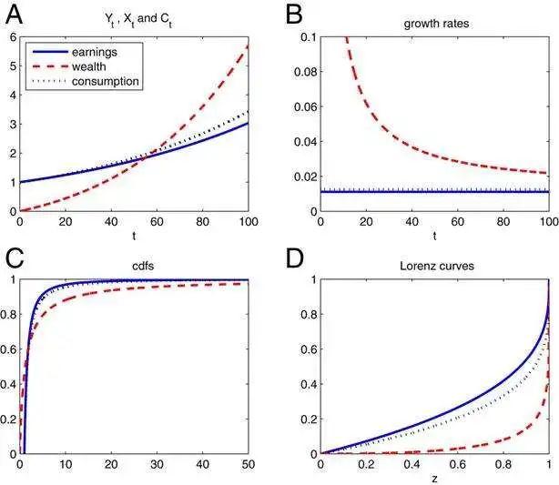 近日发表在PNAS上的一项研究验证运气、决定储蓄决策的态度和劳动收入增长率之间如何相互平衡,同时形成劳动收入、年龄和财富在人群之间的联合分布,发现均衡储蓄利润率和个人的非财务性收入增长率,在引导“贫富”竞争力量平衡中发挥关键作用。人们储蓄和企业追求资本的强烈动机促进均衡利率提升,这足以使财富增长快于劳动收入增长。另外,个人的收入增长率和个人寿命和他们对消费偏好相互作用并影响总储蓄和利润,这使得财富分配较劳动分配更加不均。
