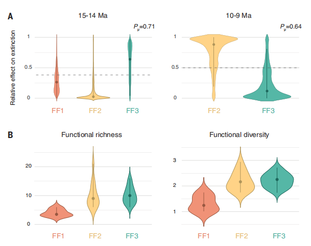 两种功能性转变的背景表明非生物变化(气候和气候驱动的生物地理环境)在系统转变中具有重要作用。然而,环境导致的灭绝模型并未发现特定特质或其组合对不同时间段内灭绝的总体影响。这种非生物因素的影响没有通过特质介导的局部灭绝来表达。相反,这些分析表明,在功能过渡期间,外来功能性动物的特征性物种显示出灭绝的风险显着高于外来动物。因此,物种在严重的生态转变过程中的灭绝,似乎是由它们对崩溃的功能系统的依附而非其特定的功能性状所决定的。