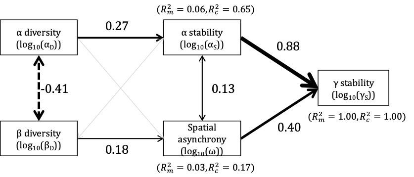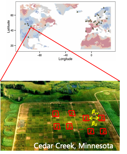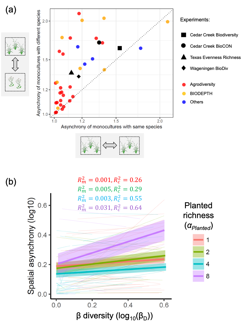 本研究利用全球39个草地生物多样性实验数据 (Isbell et al. 2015 Nature),围绕两个问题展开:(1) beta多样性是否可促进空间异步性,从而增强大尺度生态系统的稳定性?(2) alpha和beta多样性的相对重要性如何?