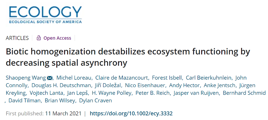 近日,北京大学生态研究中心理论生态学研究组在Ecology上在线发表了题为“Biotic homogenization destabilizes ecosystem functioning by decreasing spatial asynchrony”的研究论文(点击文末阅读原文获取全文)。该研究基于全球39个草地生物多样性实验,检验并证实了物种空间变异(beta多样性)对生态系统稳定性的作用,预测生物同质化(即beta多样性的丧失)可通过降低空间异步性削弱稳定性。论文的第一和通讯作者为王少鹏研究员。