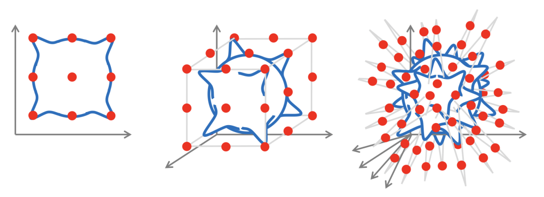 图注:维数诅咒示意图。对于一个由处于 d 维单位超立方体的象限中的高斯核组成的连续函数(蓝色),如果我们希望以 ε 的误差近似一个李普希兹连续的函数,则需要 𝒪(1/εᵈ) 的样本(红色点)。