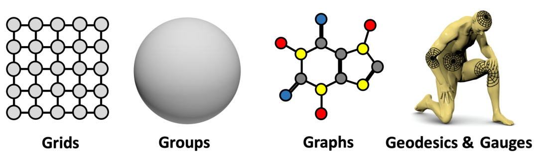 图注:几何深度学习的“ 5G”图景:网格,群(具有全局对称性的均匀空间),图(以及作为特定情况的集合)和流形,其中几何先验通过全局等距不变性(可以使用测地线表示) 和局部规范对称性显现。