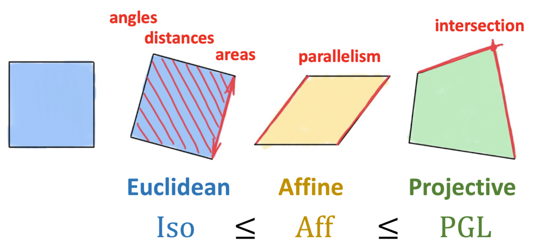 图 2:Klein 的爱尔兰根纲领将几何学定义为研究在某类变换下保持不变的性质。我们通过保持面积、距离、角度、平行结构不变的刚性变换(建模为等距群)定义2维欧氏几何。仿射变换将保持平行结构,但并不能保证距离或面积不变。射影变换的不变性最弱,只保持交点和交比不变,对应于以上三种变换中最大的群。因此,Klein 认为射影几何是最为通用的。