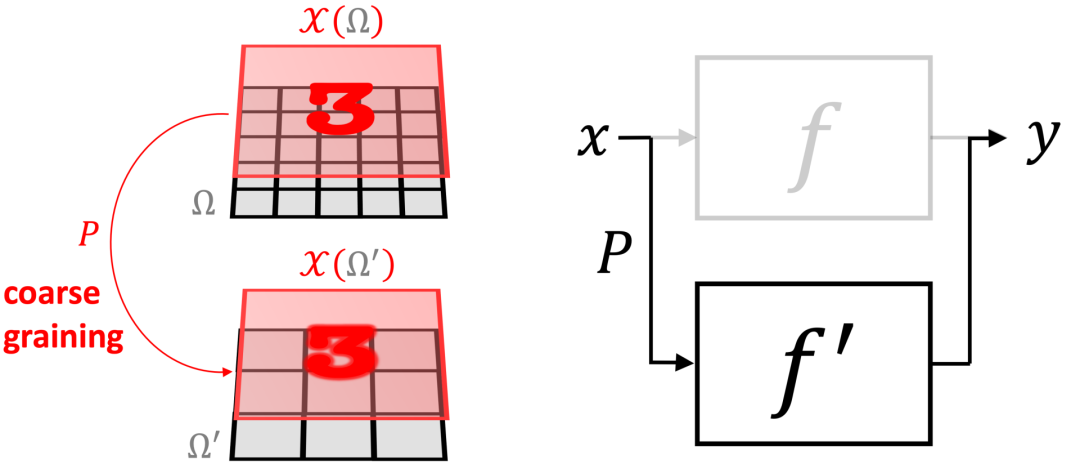 图注:尺度分离的示意图,其中我们可以将细尺度函数 f 近似为粗尺度函数 f’ 和粗粒度算子 P 的组合 f≈f′∘P