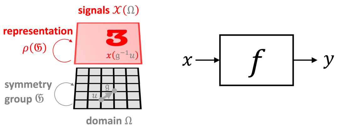图注:几何先验示意图——我们在域(网格 Ω)上定义输入信号(图像 x∈𝒳(Ω)),其中的对称群(变换群 𝔊)通过群表征ρ(𝔤) 在信号空间中进行平移操作。对函数(例如,图像分类器)如何与群进行交互的假设限制了假设类别。