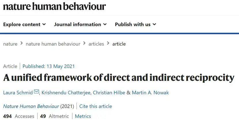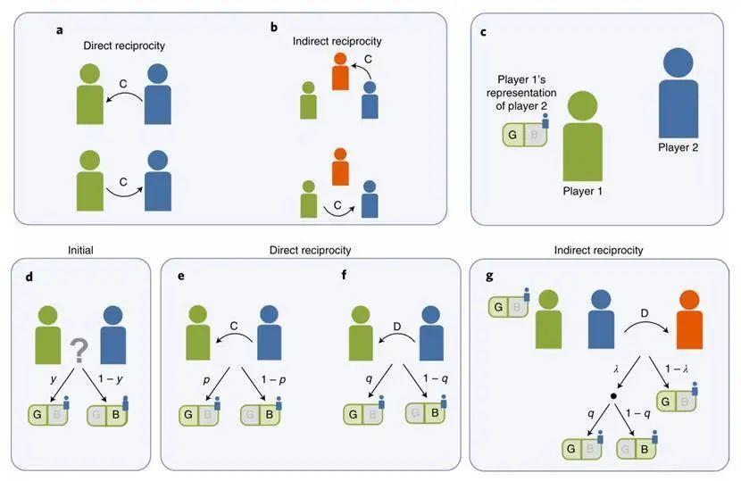 互惠原则在我们社会生活中随处可见,是合作演化的关键机制。无论什么时候,只要人们互相间回报,就认为会进行互惠行为,例如给网上卖家写一个正面评价,或者在多次互动中建立信任。以往的研究将互惠行为分为两类:第一种直接互惠(Direct reciprocity)意味着我对你的行为取决于你对我做了什么,而间接互惠(Indirect reciprocity)意味着我对你的行为还取决于你对别人做过什么。虽然这两种互惠机制相互交织,但由于种种困难现有的研究往往是单独针对其中一类互惠机制,很难在单一的理论框架内分析两种互惠机制。