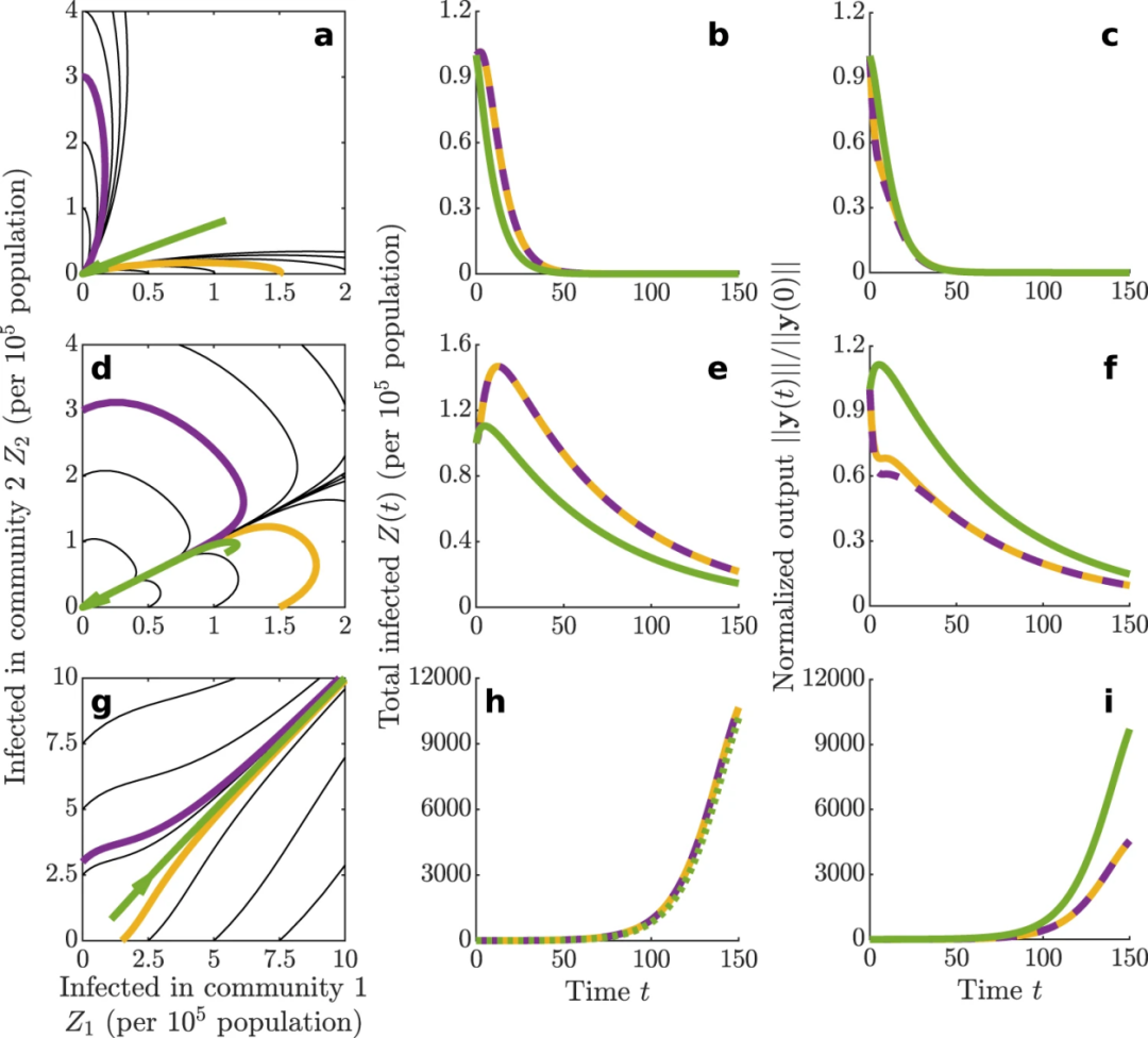 几个指数可以预测新兴传染病的长期命运及其遏制措施的效果,包括各种增殖参数(例如R0)。其他指数根据广义反应性分析评估最终注定要消失的流行病的瞬时增加的潜力。研究人员确定了扰动达到稳定的无病平衡(R0 <1)的条件,可能造成重大破坏。在本篇论文中,研究人员介绍流行病指数e0,这是一种阈值类型的指标:如果e0> 0,即使R0 <1,初始病灶也可能导致感染高峰。因此,有效的遏制措施应实现负流行指数。研究人员使用空间显式模型对意大利正在进行的大流行的预计演变进行围堵措施等级。结果表明,尽管有效繁殖数在相当长的时间范围内都低于1,但流行仍保持为正数,从而使得感染复发率在秋季大流行性反弹之前就已迅速上升。