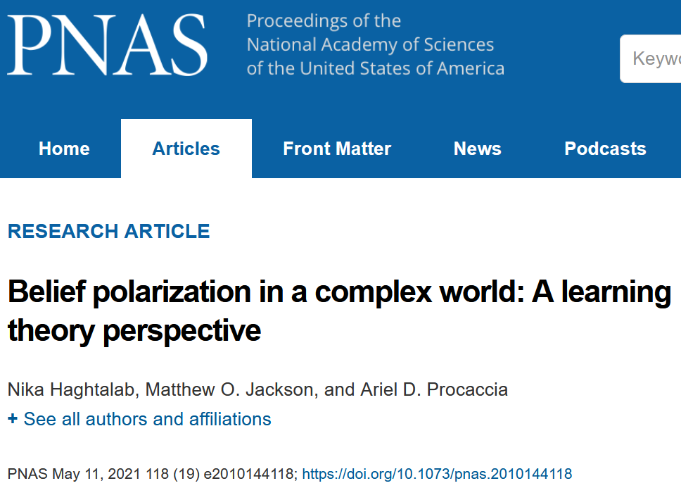 传播社会学中“回声室(echo chamber)”效应指在一个相对封闭的媒体环境上,一些意见被相似的声音不断重复、加强,回声室中的人们只能接触到支持他们已有观点的信息,使他们认为这些扭曲的故事就是事实的全部。当回声室中的人们在面对不同信息源时,往往会形成一个个具备相同认知的小群体,这种现象被称为认知极化(belief polarization)。5月11日发表在PNAS上的一篇文章通过机器学习的理论建立人类认知形成的模型,并指出即使面对相同的信息源,人们也会形成不同的认知。