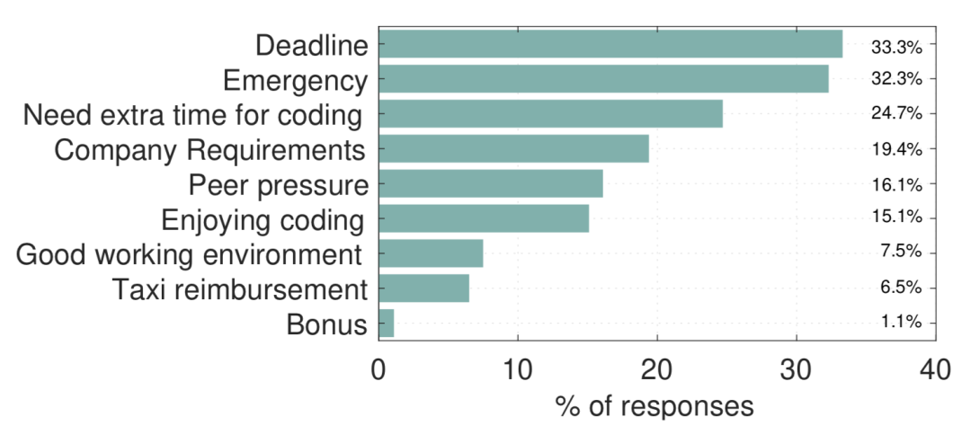 图2. 受访程序员对加班理由的回应。我们列举了9个常见的加班理由并请受访者选择所有符合自身情况的选项。图中右侧的数字显示了选择各个加班原因的受访者所占比例。