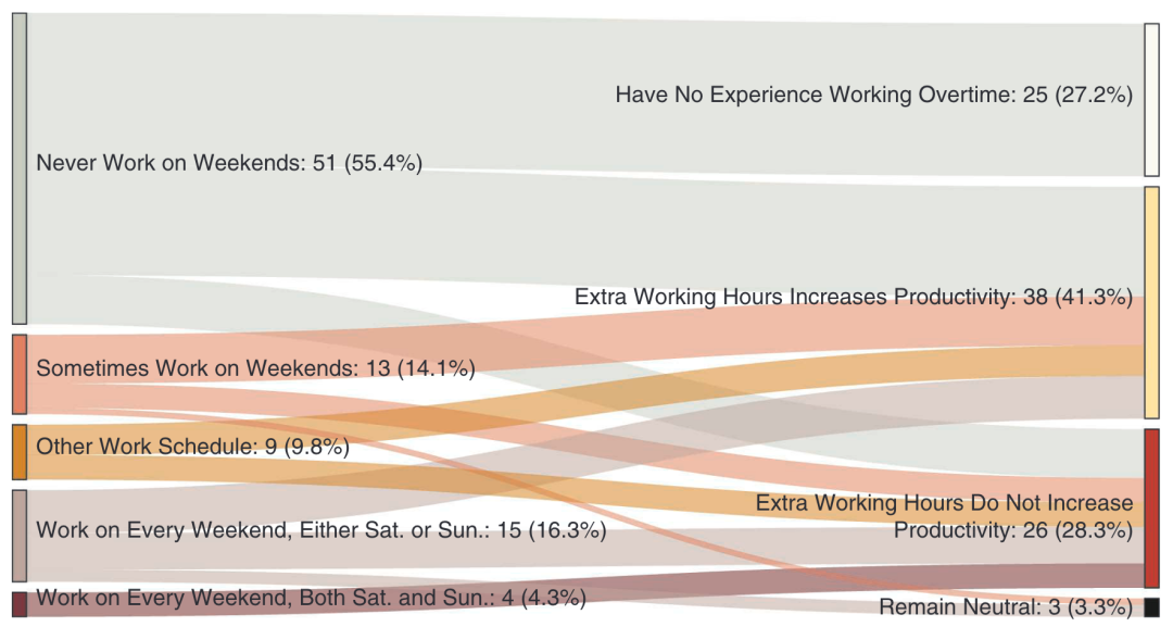 图3. 周末加班频率(左)和加班能否提高生产力(右)的回应。对于周末加班频率,受访者可以选择:从不、偶尔、每周周六或周日、每周周六和周日、或其他。对于加班能否提高生产力,受访者可以回复同意、不同意、或中立。图中标签旁边的数字和百分比分别代表选择该项的人数和比例。