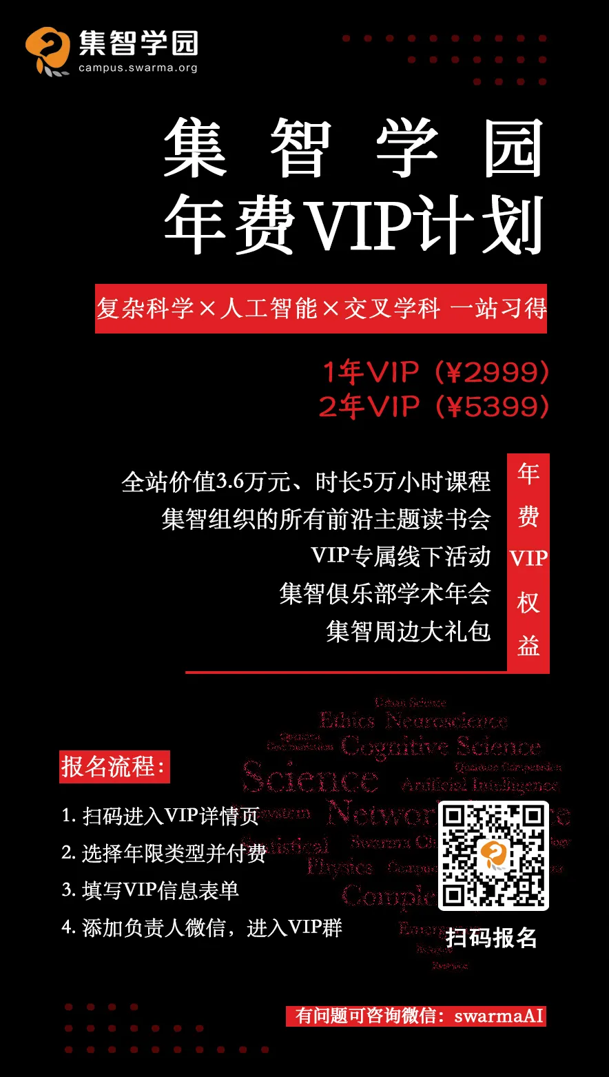 为了帮助有学习需求的朋友夯实学科基础,帮有科研需求的朋友深入前沿交流,我们开放了1年制和2年制的集智学园VIP计划。VIP用户可以深度参与集智俱乐部社区,并在会员期内解锁集智学园全站课程权限。