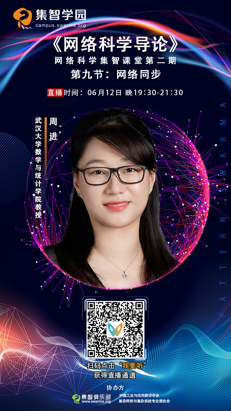 6月12日(周六)晚 7 点 30 分,武汉大学周进教授将为我们讲解复杂网络同步相关内容,欢迎对这一主题感兴趣的朋友,扫码预约。
