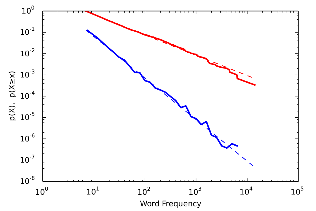 图3. 神经元连接数据的CCDF(红色)和PDF(蓝色)曲线。