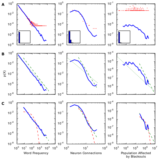 图1中三列子图包含三个示例数据集和拟合结果,分别表示幂律良好拟合、中等拟合和较差拟合。第一列的数据,也是最好的拟合数据集可能是所有幂律分布中最著名和最可靠的:英语单词使用频率。具体使用的数据是Herman Melville的小说《Moby Dick》中词语的使用频率。第二列的数据是线虫每个神经元的连接数。最后一个拟合不佳的数据是1984年至2002年间受停电影响的美国人数。