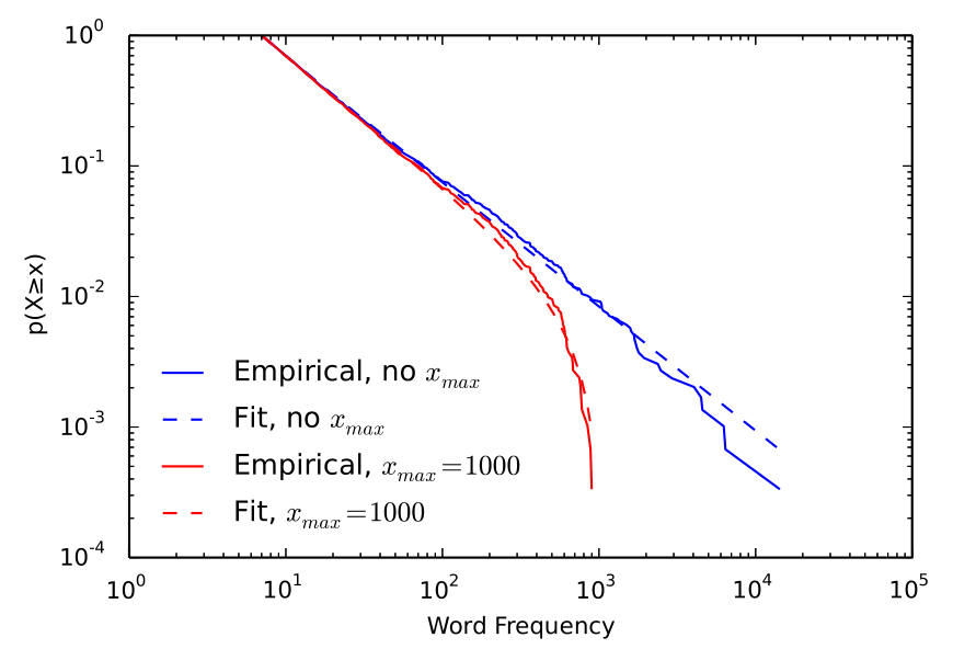 另外,一些领域也希望分布有一个精确的上界x_max,因为有时考虑实际情况一些数据可能超出了理论极限(例如在天体物理学中,速度的分布在光速下可能有一个上限)。powerlaw库同样能满足这部分用户的需求。