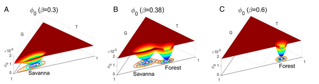 最近,研究人员展示了来自非平衡统计力学的景观通量理论如何提供一个强大的框架来研究这些问题,使用众所周知的稀树草原-森林模型,通常称为 Staver-Levin (SL) 模型,作为案例研究。在这里,稀树草原是指以草为主的状态,有一些树木和树苗,而森林是指以树木为主的状态,很少有草和灌木。