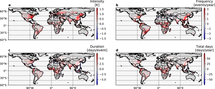 研究人员提出了ESM模型(state-of-the-art Earth system models) 。在之前,传统预测在几乎所有方面都大大低估了城市热浪(urban heat waves,UHW) 的风险,包括强度(UHW 期间的平均时长)、频率(每年 UHW 事件的平均数量)、持续时间(每个 UHW 事件的平均天数)和总天数(持续时间乘以每年天数的频率)(如下图所示),但这些大多忽略了城市物理学。这些相对于背景非城市信号的正异常在空间上不是均匀的,证实了传统模型的投影不能简单地再现局部尺度的 UHW 现象。