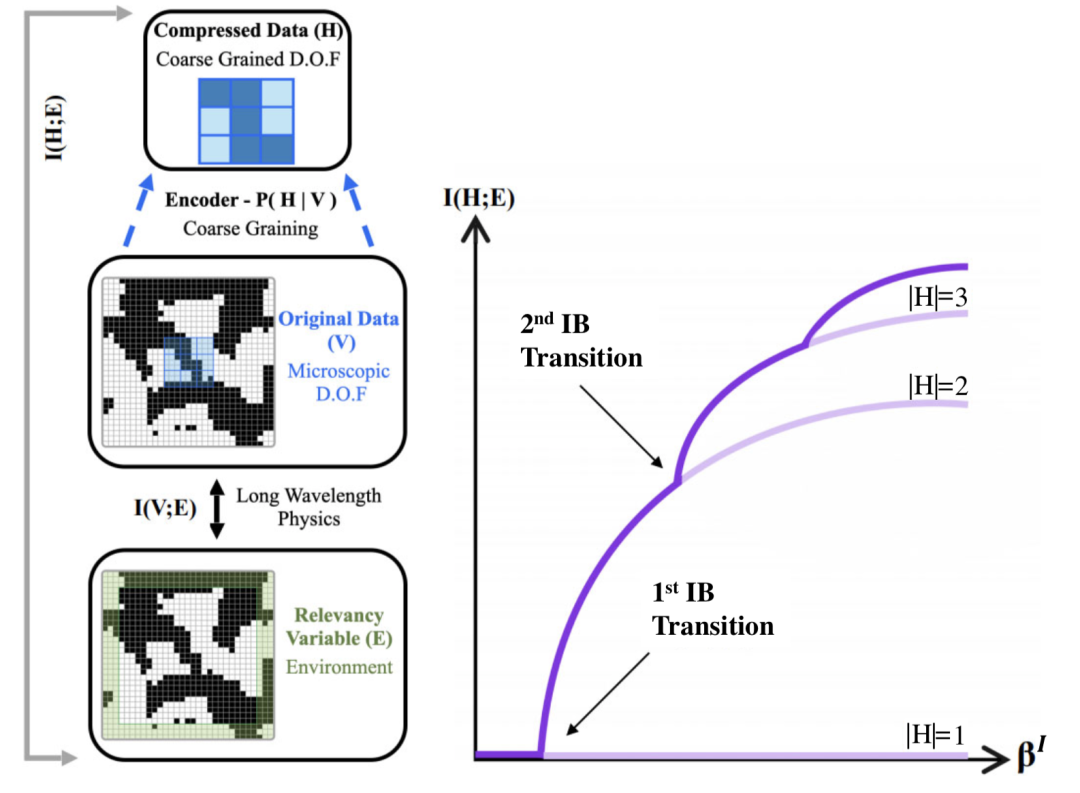 左侧:IB方案的流程图:构建了一个最佳编码器,用于提取有关包含在V中的相关变量E的信息。右侧:IB 曲线描绘了相关信息。信息为βI的函数,在转换的临界值发生新的解决方案,具有增加的基数的压缩变量H出现,旧的解决方案成为不稳定最小值。
