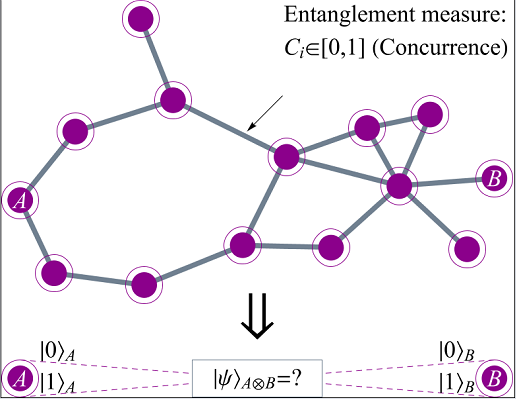 图1:如果两个节点 (node) 共享一对纠缠的量子比特,则表示为被一条链路 (link) 连接。这里A与B没有直接相连,所以并不共享任何纠缠量子比特。然而,通过纠缠传输,A与B之间仍然可以建立纠缠。纠缠传输的成功与否取决于每条链路的自身传输能力——其可以通过一种介于0与1之间称为通粹纠缠度的量子纠缠测度来度量。