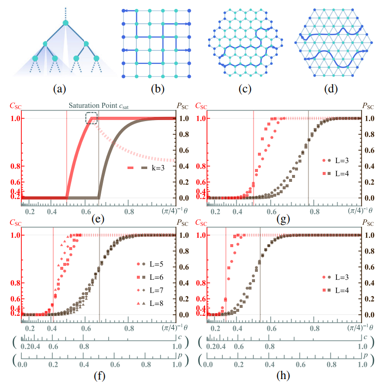 图3(e-h)展示了基于两种理论不同的串并联规则(及SM变换)得到的渗流阈值(红色竖线,棕色竖线)的对比。通粹渗流理论预测的渗流阈值要显著小于经典渗流理论,意味着即使每条链路的纠缠度小于经典渗流阈值,也可以实现长距离量子传输。实际操作上,由于串并联规则由量子通讯协议直接确定,这表明任何仅由串并联规则构成的串并联结构量子网络都可以通过局域操作与通讯的方式实现通淬渗流理论的结果;另一方面,尽管SM变换得到的近似高阶连通规则无法由局域操作与通讯实现,但可以通过多链路路由和多体量子协议方案来逼近。