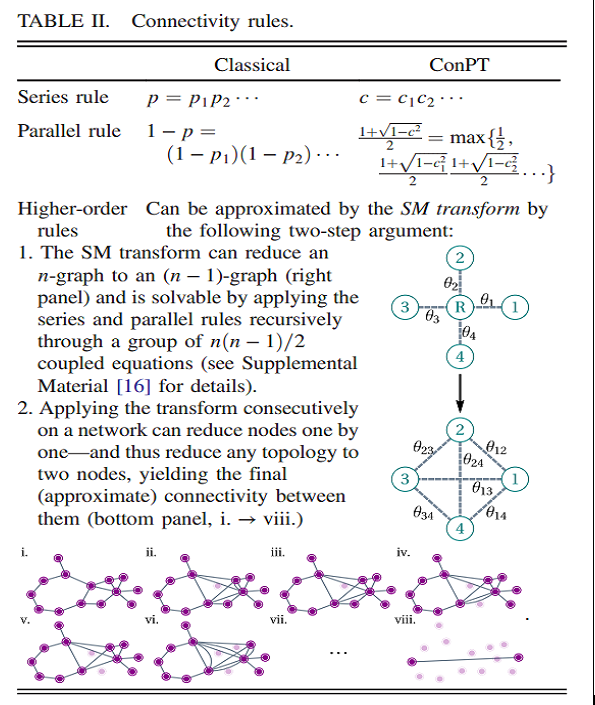 表2:经典渗流理论 (Classical) 与通粹渗流理论 (ConPT) 的串并联连通规则对比。