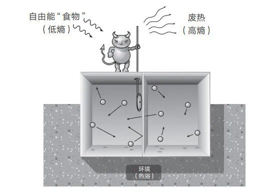 图2:作为生命范例的麦克斯韦妖。小妖精在盒子里维持秩序——温度的分离,通过将自由能转化为高熵热量的信息处理过程来对抗环境的影响。(图中文字:自由能“食物”(低熵);废热(高熵);环境(热浴))