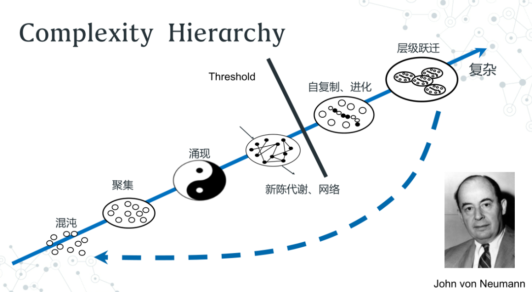 如果把系统复杂性的演化过程比作阶梯,每一级代表不同高度的层级,攀登阶梯中,从量变到质变的关键一步或许是从涌现到自指。我们清楚的知道,能够进行自指、自复制的系统比产生涌现现象的系统更加高级,那么,在攀登复杂性阶梯中,究竟发生了什么?