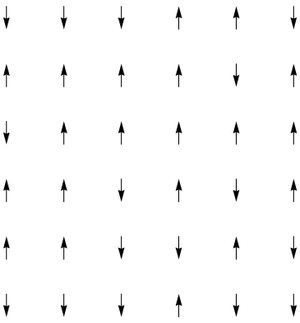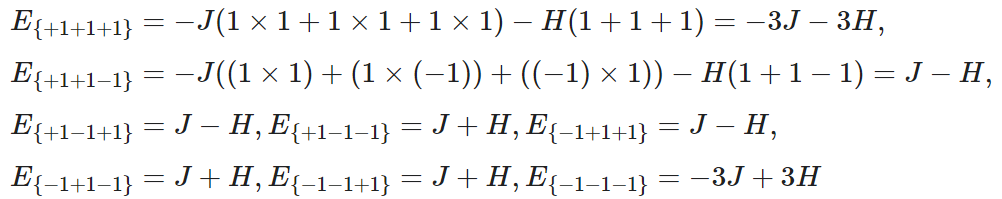 我们可以通过总能量的概念来刻画这种相互作用:即如果两个相邻方格的小磁针状态一致(例如都是朝上),则系统的总能量减1单位,否则如果不同就加1单位。外界还可能存在磁场,如果小磁针方向与外场方向一致,则能量也会降低。我们定义总能量: