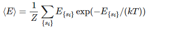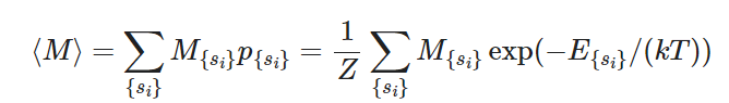 其中N为系统中所有小磁针的个数。M{Si}是系统中在给定状态Si条件下,总的磁矩(每个小磁针向上或者向下都是矢量)。在稳态条件下,系统满足平衡分布,那么,对所有可能的状态按照它们出现的概率进行加权平均就得到了整个系综的平均磁矩(即对所有可能的实验结果求平均):