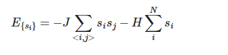 其中J为一个能量耦合常数,E{Si}表示系统处于状态组合{Si}下的总能量。求和下标<i,j>表示对所有相邻的两个小磁针进行求和。我们看到,如果Si=Sj,则总能量就会减少J。H表示外界磁场的强度,它是一个参数,如果外界磁场向上H为正,否则为负。如果某个小磁针的方向与外场一致,则总能量减少一个单位。