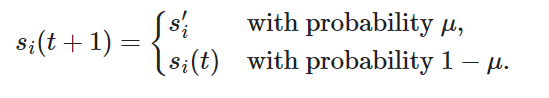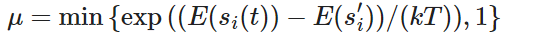 具体作法是:在每一个仿真周期,模拟程序会根据当前的状态组合Si(t),进行小的改进(例如随机翻转某一个小磁针),得到一个新的状态组合S’i。但是系统下一时刻的状态并不是直接取为该状态组合,而是以概率发生: