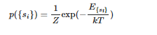 在玻尔兹曼分布中,每个状态组合出现的概率将会与该状态组合下的总能量的负值呈现指数关系。也就是说,能量越小,该状态组合的出现概率也就越大。反之,出现概率会随着能量增加而快速衰减。并且温度T会对衰减速度起到调节作用。这里出现概率的具体含义是指:如果针对同样参数和初始条件的伊辛模型进行多次重复试验。运行很长时间后,我们观察这些伊辛模型处于什么样的状态组合,则某一状态组合在若干实验中的出现频率会接近波尔兹曼分布。用统计物理的术语来说,这些试验就称为一个系综。