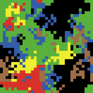 这张图展示了模型的一个瞬间的状态,其中每个村民都有6种不同的政治观点,它们被表达为6种不同的颜色。