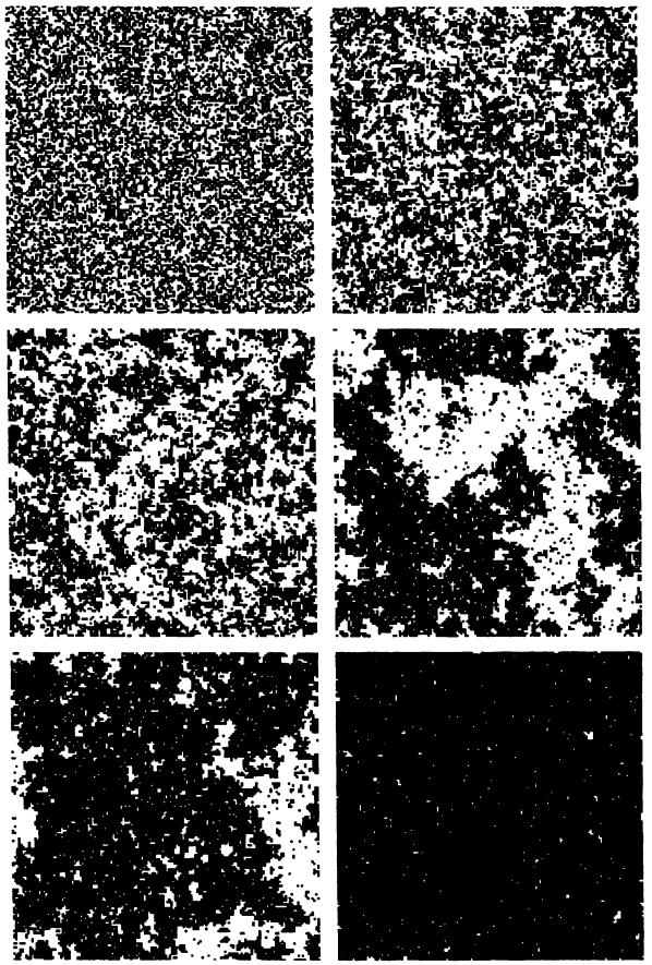 临界现象不仅仅是伊辛模型、铁磁物质所独有的,它具有相当的普遍性。它会在很多复杂系统中体现出来,例如气-液相变过程、湍流,甚至股票市场、经济系统等。临界系统体现出的一个重要特征就是:自相似性和长关联性。伊辛模型临界状态模拟图如下: