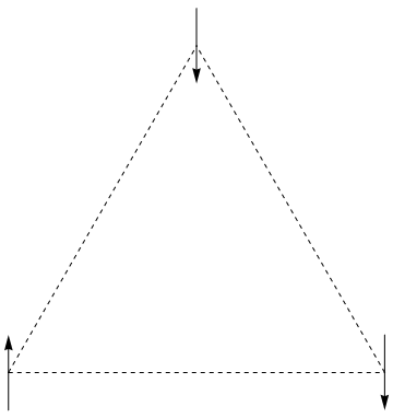 例如,假设系统中仅仅有3个小磁针,它们彼此相连(虚线表示构成邻居关系)形成一个三角形,如图: