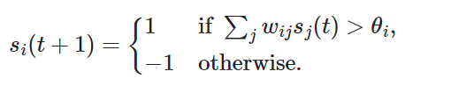 在初始时刻,我们把输入向量映射为每个神经元的激活、未激活状态。然后,Hopfield网络的运行规则如下,在每一个仿真周期,每个神经元根据下述规则更新状态: