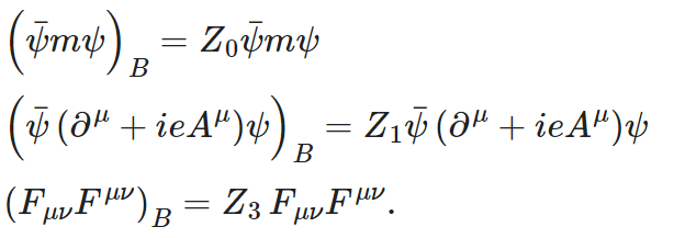 一种描述微扰理论修正发散的方法是由Hans Kramers,Hans Bethe ,Julian Schwinger,Richard Feynman和Shin’ichiro Tomonaga,and systematized Freeman Dyson in 1949.在1947-49年发现的,并在1949年被Freeman Dyson系统化。发散出现在含虚粒子闭环的费曼图的辐射校正中。