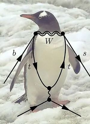(c)电子发射一个光子,发射第二个光子,并重新吸收第一个光子。这个过程如下面的图2所示,它被称为顶点重正化。费曼图也被称为“企鹅图”,因为它的形状很像企鹅。