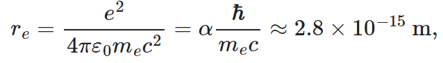 当时re → 0,它会变得无穷大。这意味着点粒子具有无穷大的惯性 Inertia,使它无法被加速。顺带一提,使得mem等于电子质量的这个值re被称为电子经典半径 Classical Electron Radius,它(设置q=e以及c和ε0的还原因子)被证明是: