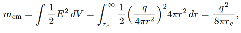 带电粒子的质量应包括其静电场(电磁质量)中的质能。假设这个粒子是一个带电的半径为re的球壳。场中的质能是: