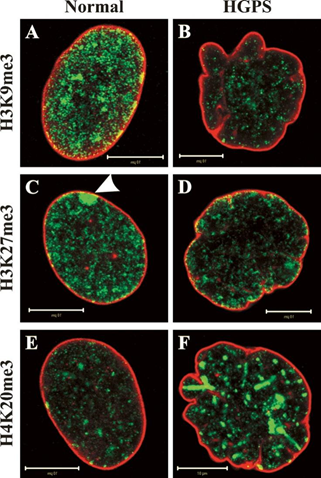 有很多跟衰老有关的疾病事实上就是通过染色质结构的改变导致的,比如Hutchinson-Gilford Progeria早衰症。导致这种疾病的原因是细胞核的核纤层上面的一个突变。原来正常的细胞应该是椭圆形的,出现突变之后细胞就会变成像右边那种畸形的形态。因为核纤层有这样一种很重要的功能——帮助染色质进行空间上的组织,因此在突变的细胞里面,染色质的结构会出现很严重的问题。