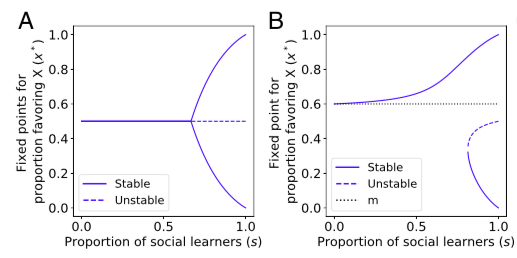 如果上面例子中其它条件不变,只是两种选择的相对收益变为0.6(代表选项X优于Y),此时社会学习者的比例越高,接受高收益选择的人的比例也越高;但一旦社会学习者的比例超过临界值,那么相对收益差的选项反而也可能被选择(图2B)。图中有两个稳定的状态(实线表示),说明这时系统的演化取决于初始情况,而虚线代表对应的状态是不稳定的。